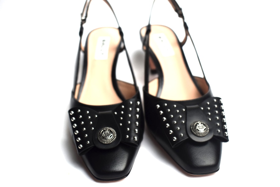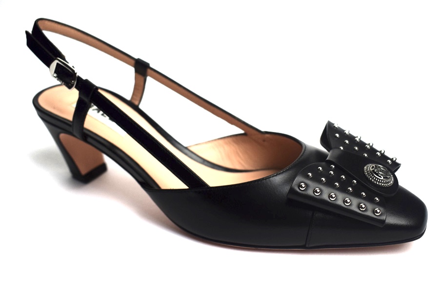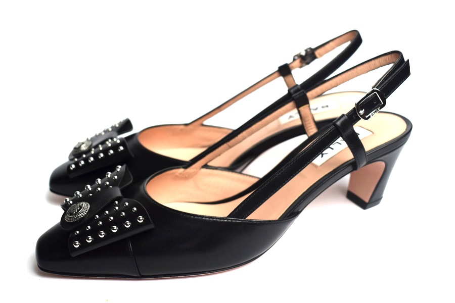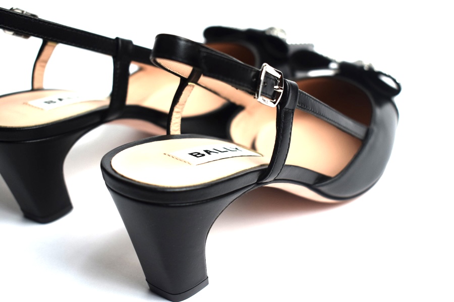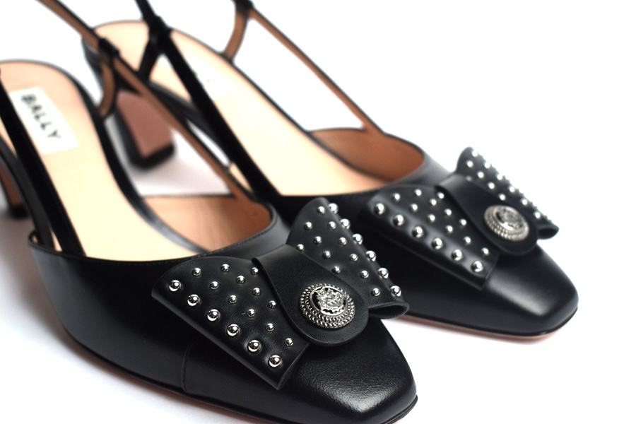 Classic ladies slingback shoes in all-black. These leather pump is finished with an iconic bow from the Bally archives, refreshed with a Crest ornament at the center and studded work.